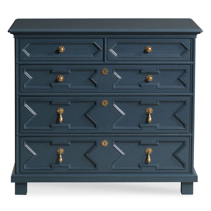 A rectangular molded top rests over five individual drawers veneered with oak. The drawers are accented by intricate overlaid moldings above a molded base with rectangular feet.