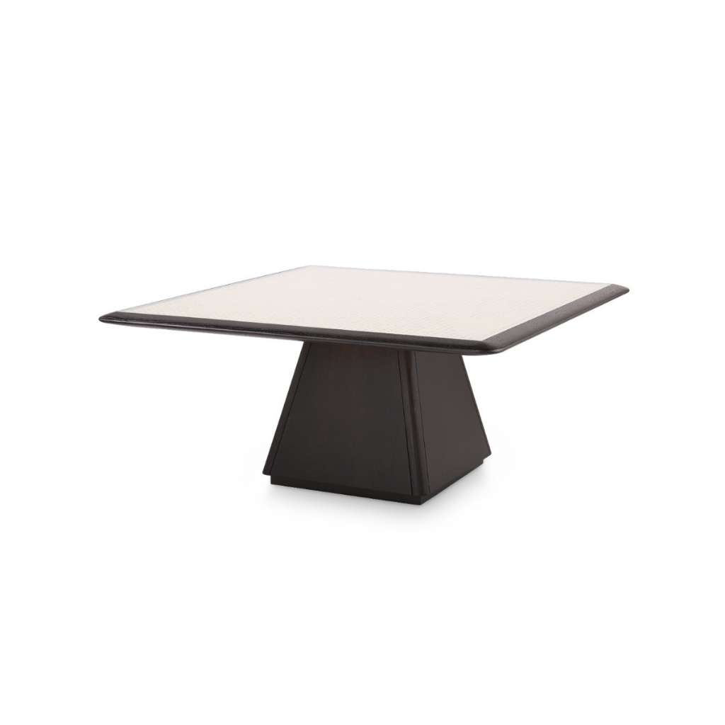 With its simplicity of line and its emphasis on materials, the Alma collection is a blend of Scandinavian and Japanese aesthetics. It comes in both bleached cerused oak and espresso oak, and features a woven-cane and glass top that imparts an airy, contemporary, and minimalist appeal.