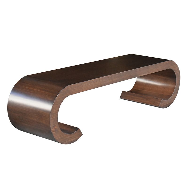 A very unique furniture item with a rectangular upholstered cushion that is attached to the wood frame with belts and brass bolts elevated on curvaceous volute shaped ends.