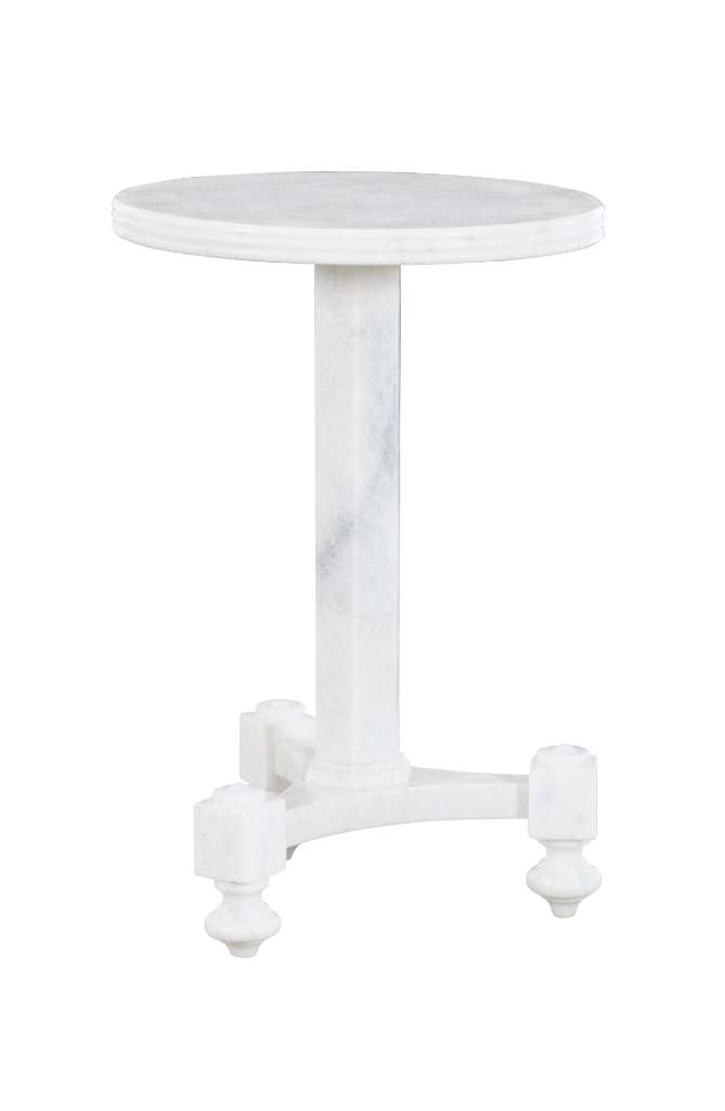 Crafted from solid Ambaji White marble, this turned spot table reinterprets traditional wood turnings in exquisite stone. Extensive engineering was required to achieve its delicate turnings and intricate molding details. The uniquely turned legs elevate the base, seamlessly transitioning into a chamfered post, while a solid marble slab with a refined ribbed edge crowns the design. Semi polished, non-sealed.