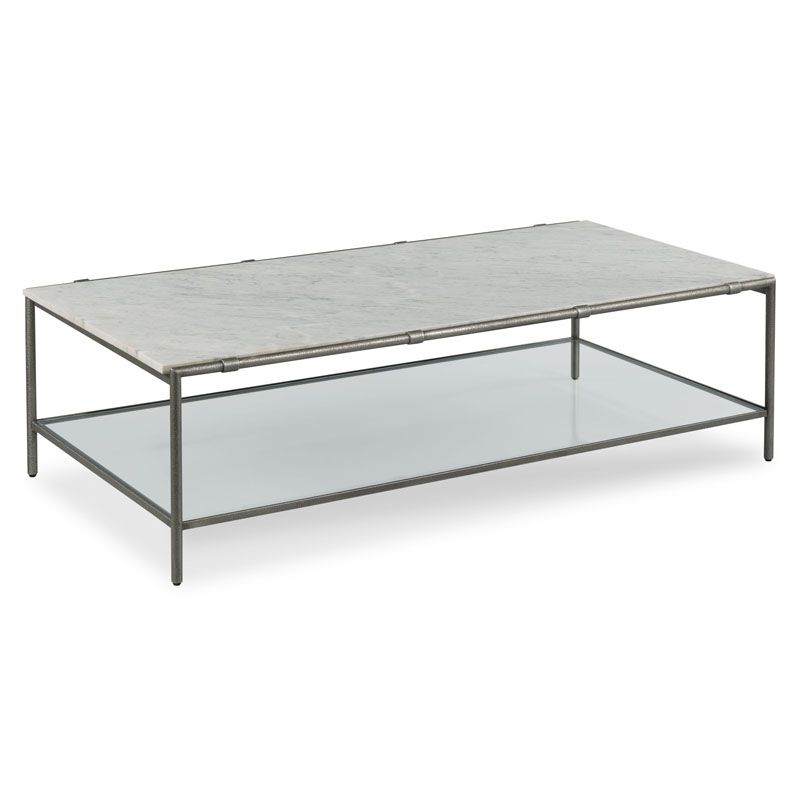 This coffee table is a testament to contemporary design, combining the natural beauty of honed Carrara marble with the depth and charm of textured metal. Complete with a lower glass shelf for storage and display.