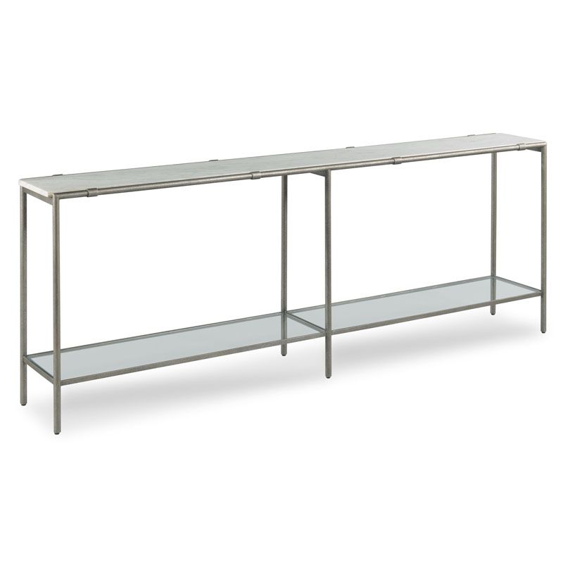 This console table is a testament to contemporary design, combining the natural beauty of honed Carrara marble with the depth and charm of textured metal. Complete with a lower glass shelf for storage and display.