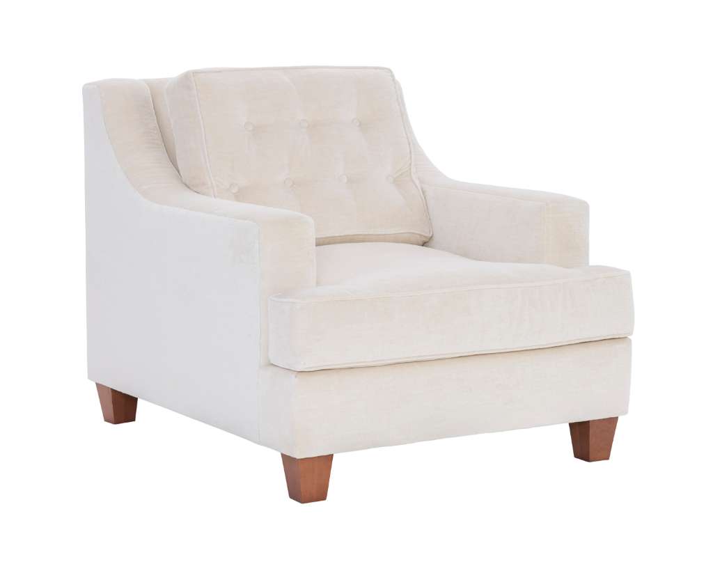 The Annabelle Chair is an extension of the sofa translated into lounge chair proportions. Featuring clean French modern lines and a refined tufted detail, this chair design showcases a wood finish on the feet, exemplifying luxury and elegance.