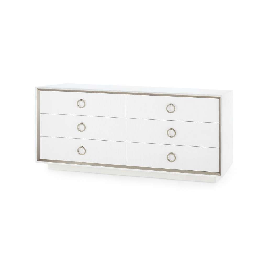 Rich and refined, our Ansel Extra Large 6-Drawer is a sophisticated storage solution fit for a home or office. Run your fingers over its hand-applied lacquered linen finish and you’ll feel its timeless quality, like a 1920’s heirloom reinvigorated for the 21st century. Set upon a platform base, its splendid white facade is made all the more elegant by an inlaid champagne border, beveled for a bit of dimension. As for its six, soft-closing drawers? Their stained-wood interiors supply both space and style.