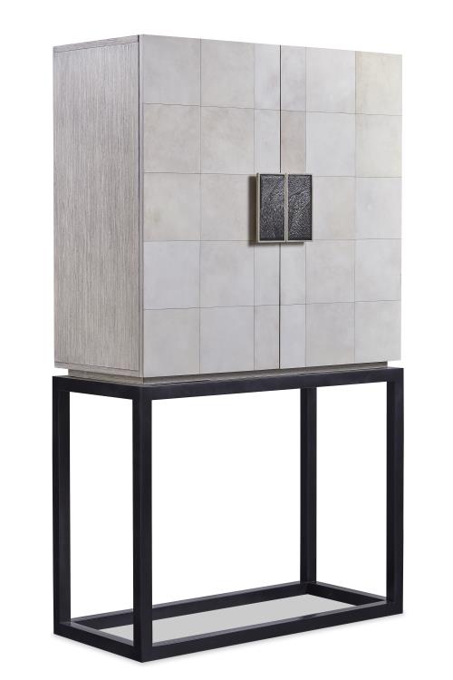 W 40 D 18 H 70 Real Vellum front bar cabinet with custom hardware. This bar cabinet features a mirrored interior with adjustable shelves, two pull-out drawers, a pull-out glass cutting board, and a puck light. Black metal base. Out of Stock