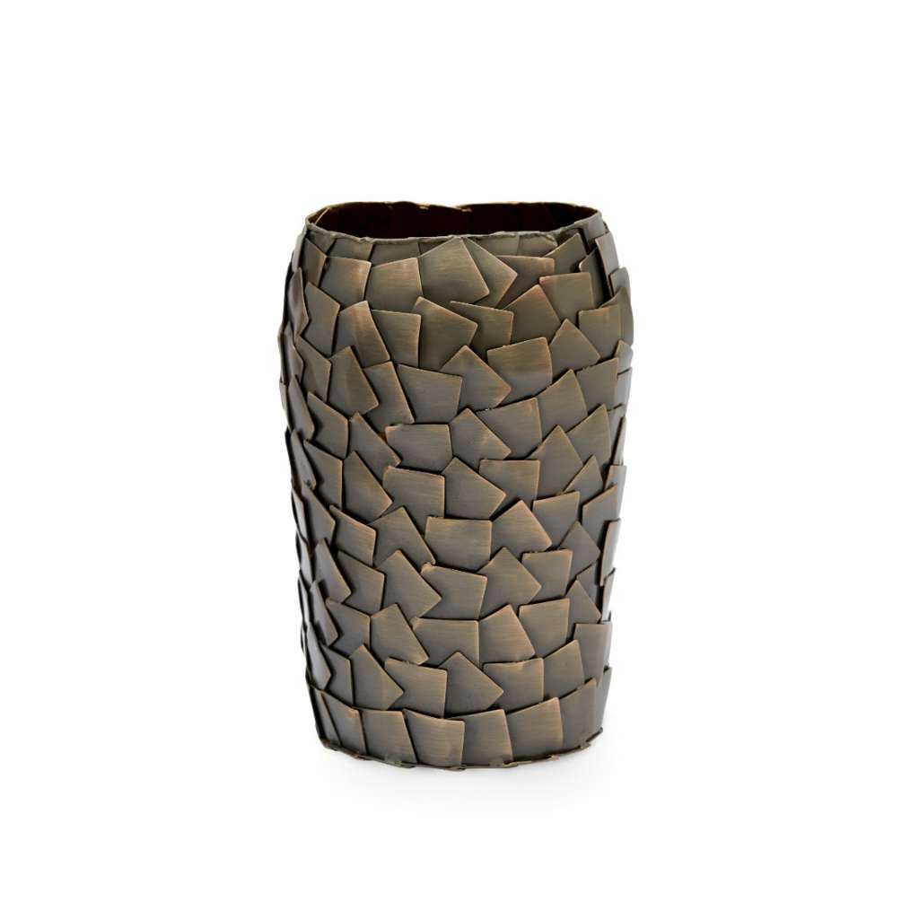 A modern play on deconstruction, the Apsis Collection is composed of paper-thin brass tiles that have been hand-soldered into intricate sculptural decor pieces. These multi-dimensional hand-crafted shapes are then finished in brass or bronze for added sheen. The Apsis Vase sits beautifully alone or can be paired with the matching Apsis Bowl on your dining table, sideboard, or entryway console.