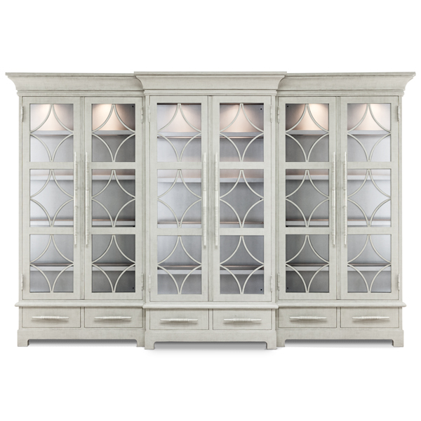 Exterior Finish: Sterling SilkInterior Finish: Silver MoonWith Clear Glass Doors and SidesWood Framed Glass ShelvesHardware: Arabi Pulls in Sterling SilkWidth: 132” | Height: 89” | Depth: 18”Available in all OBD finishes.Custom sizes available.