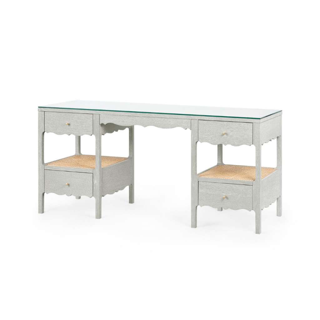The Arianna Desk is a soft, romantic piece that will surely be a Villa & House classic. It’s made of cerused oak, and each surface is covered with octagonal cane. Featuring four drawers, this stand-out design is adorned with hand-carved detailing as gorgeous and as delicate as the flourishes of a quill pen. The top surfaces are protected by clear inset glass which is tempered for strength. This is a beautiful desk that would work in a traditional home, cottage, or any space that needs a soft organic touch.