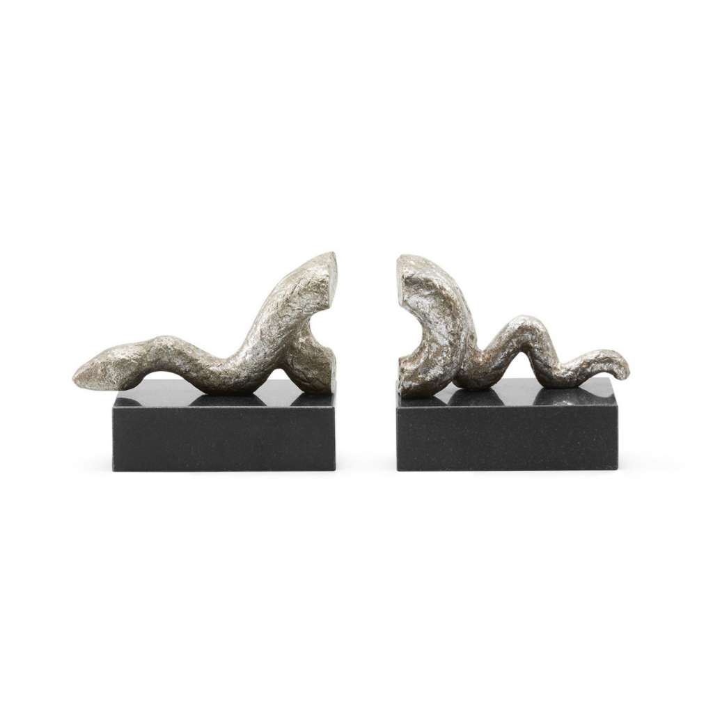 Though you can’t always judge a book by its cover, you can certainly spot taste in someone’s bookends. This serpentine pair punctuates your favorite titles with a sculptural sense of continuity and seamless flow. With their artisan-refined expression of molten metal, hand-leafed in silver, the Asp Bookends nod to classical Greek or Roman antiquity while a polished base of black marble, keeps them firmly rooted in the sophisticated present. Either used together or placed individually, they make a strong statement atop a desk, bookshelf, or side table.
