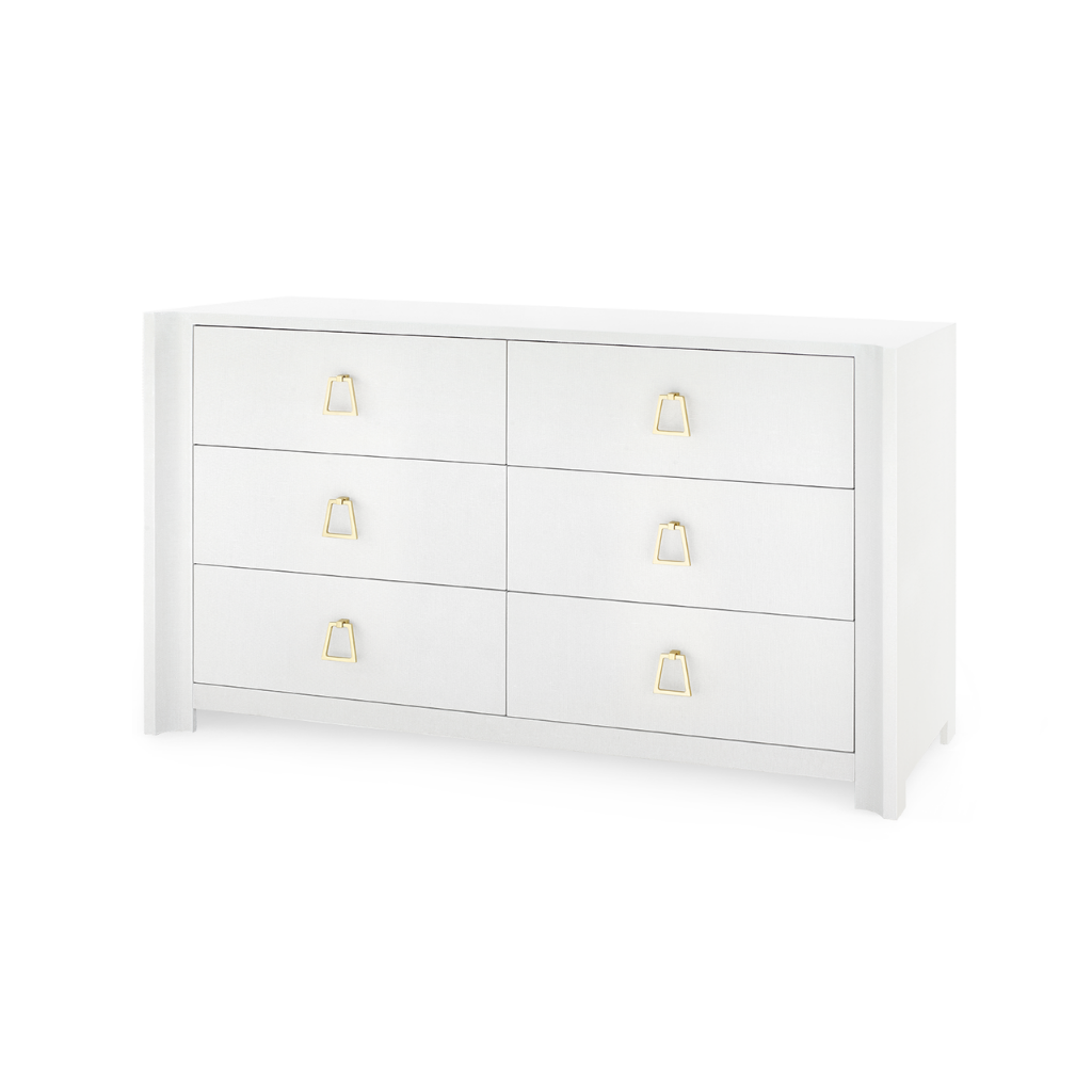 We love our Audrey Collection for its refined simplicity and timeless silhouettes, made all the more sophisticated by its rich mixed materials. A classic storage solution with an upgrade, the Audrey Extra Large 6-Drawer is outfitted in lush lacquered sanded linen, boasting six drawers that open to reveal roomy, veneered interiors. Complement the soft cream finish with your choice of metallic pulls—a subtle but effective way to fit the piece exactly to your tastes. Plenty of surface space means you can put this gorgeous furnishing to work, topping it with lamps, a vase, or any other decorative objects you’d like to show off in a bedroom or study.