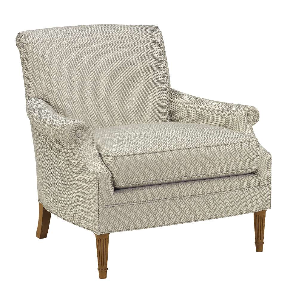 The Audrey is a more feminine approach to the club chair. Available in fabric or leather, the design features a tight back, button-detailed arm posts and a deep, loose box seat over turned, fluted legs. Oxford finish shown. Spring-Down seat cushion standard.