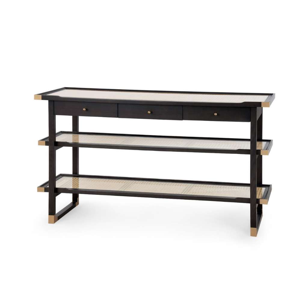 The Austin collection is influenced by traditional Japanese furniture design which emphasizes simplicity, natural materials, and understated natural finishes. The silhouette is reminiscent of traditional Japanese architecture with strong horizontal elements, while the hand-woven cane shelving, bronze-accented corners, and hand-carved grooving, which surrounds the top, speak of fine workmanship. Integrated concealed drawers maintain the integrity of the design and the glass shelving sits atop the woven cane protecting it and imparting airiness to the piece.