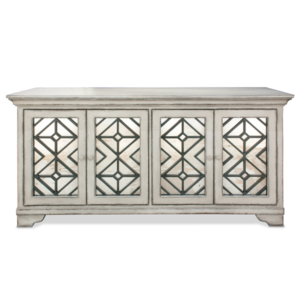 Finish: Vintage WhiteTrim: French Blue MullionsGlass: Antique Mirror DoorsWidth: 72” | Height: 34” | Depth: 24”