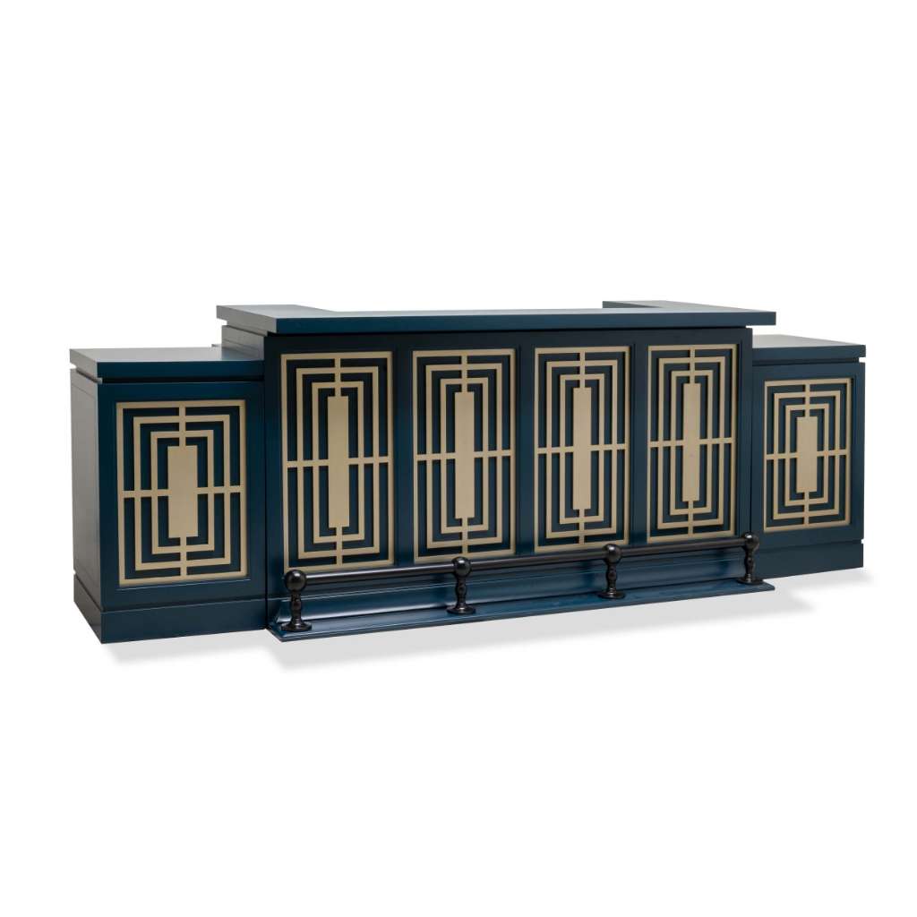 Body Finish: Atlantic BlueMullions Finish: CavaHardware: Holmes Knobs in Antique Brushed BrassFootrail Finish: BlackWidth: 120” | Height: 42” | Depth: 35” | End Depth: 23"Available in all OBD FinishesCustom sizes available