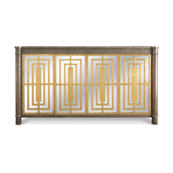 Finish: GreyscapeWith Gold Leaf MullionsOver Antique MirrorTouch Latch DoorsInterior: Two (2) Sections behind Double DoorsOne (1) Adjustable Shelf per SectionWidth: 72" | Height: 40" | Depth: 21"