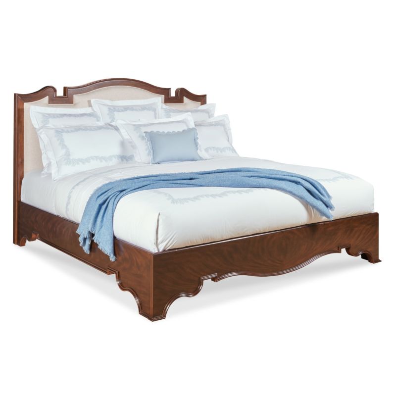 A lovely bed with intricately molded framing that surrounds a padded upholstered headboard attached to molded side and foot rails.