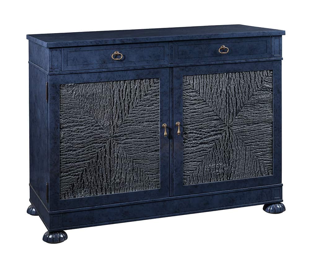 Bold in a deep blue finish, the Bark Door Console is a delectable blend of timeless and trendy. This handsome table is expertly crafted of maple accented with pendant and ring pulls and features an interesting play of texture on its doors. It’s a stylish and functional piece that brings dimension to any room.