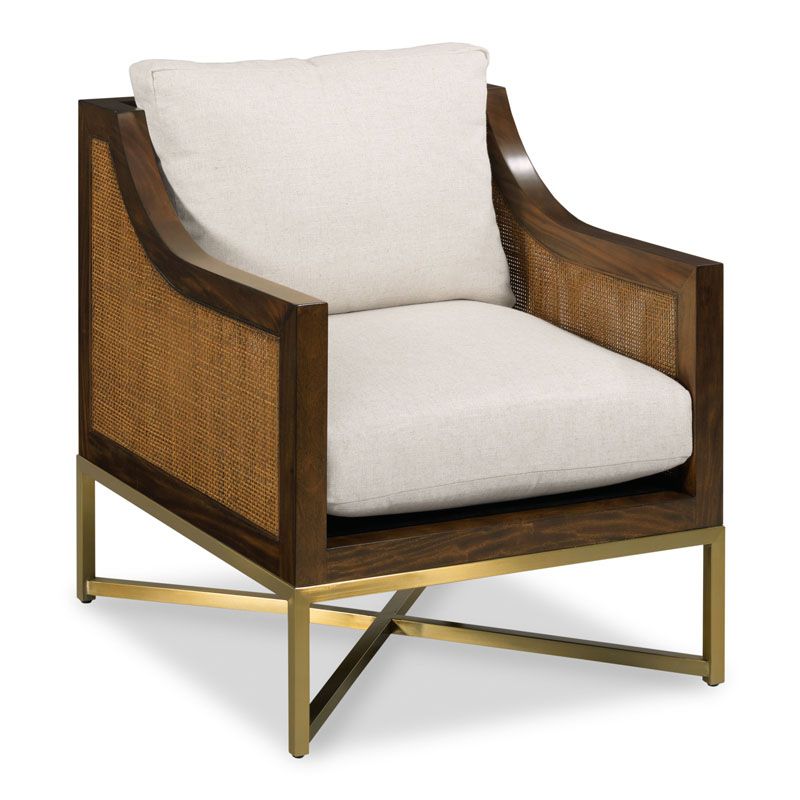 A terrific respite at days end with descending curved arms that are adorned with linear modern cane flank, a loose seat and back cushion, elevated on a brass plated base.