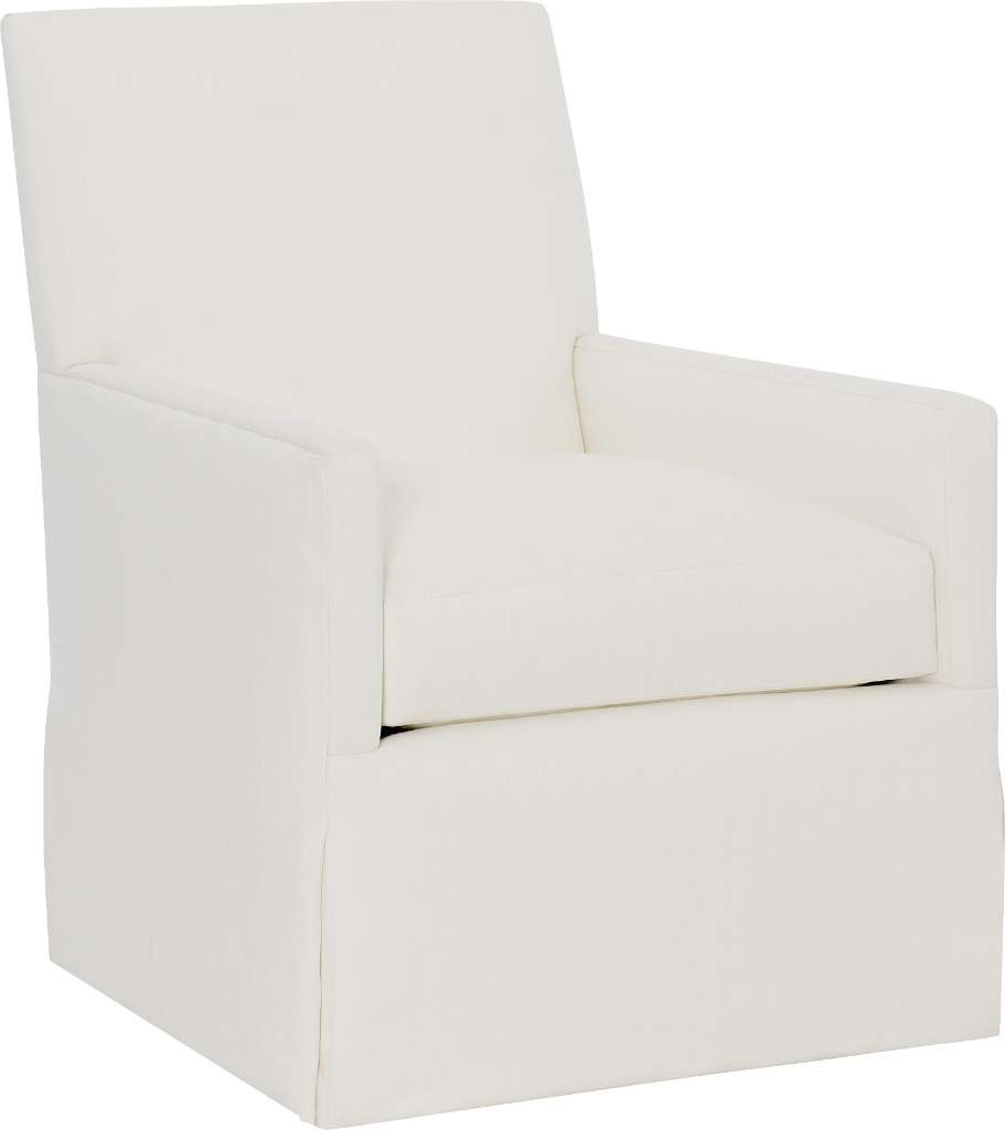 This quiet yet attractive chair screams comfort, while it maintains a tailored and refined aesthetic. This chair comes standard with a goose feather back pillow (not shown) and Dressmaker skirt.
