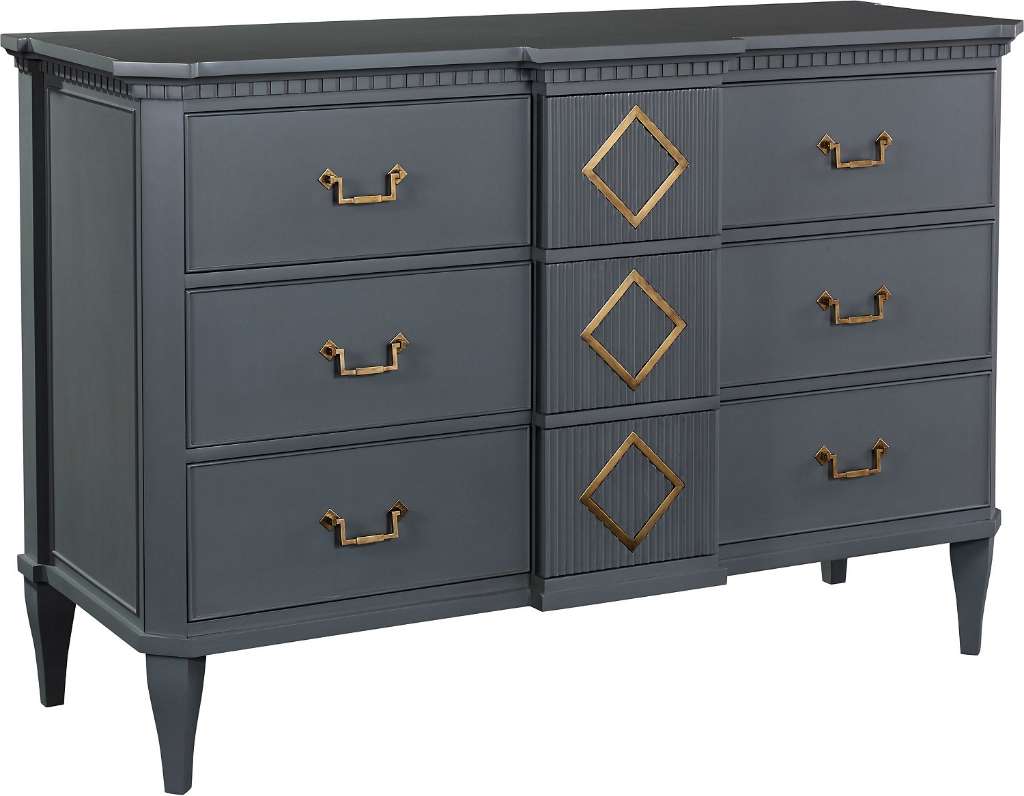 The Bess Dresser is inspired by a Gustavian Swedish antique, reimagined with a timeless yet modern sensibility. Thoughtfully proportioned, it features nine drawers accented with Burnished Brass hardware. Chamfered front legs lend a distinctive silhouette, while the fluted center drawers sit slightly proud, adding depth and dimension. Each center drawer is adorned with a brass diamond inlay and discreet hidden finger pulls along the edges for seamless functionality. Meticulously crafted from solid Maple with Beeswing Primavera veneers, the Bess Dresser embodies Hickory Chair’s commitment to fine craftsmanship. Traditional dovetail joinery and smooth wood glides ensure lasting durability, refinement, and effortless use.
