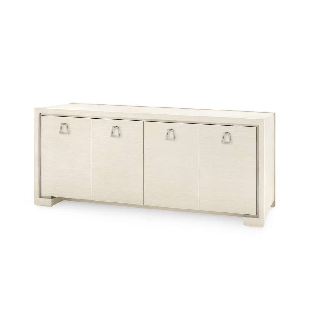 Art Deco glamour is met with architectural design in our Blake Collection, marked by subtle contouring of its sleek edges along with distinct details, such as the L-shaped legs, which cut an elegant figure. The Blake 4-Door Cabinet appears as a jewel box in a living room or bedroom, crafted from wood and lacquered to give it a luxurious sheen. Four doors, each with veneered interiors on soft-closing glides, are framed by a recessed champagne finish border and made complete with an oversized pull.