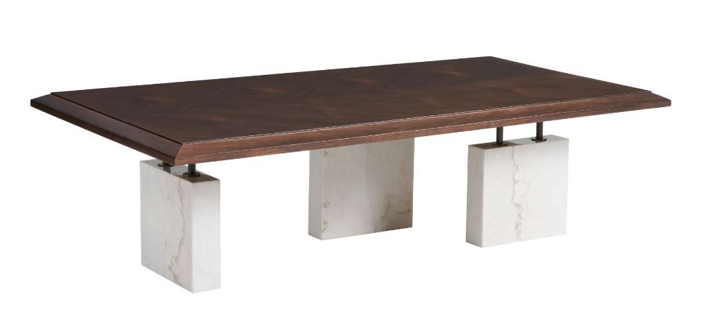 The Block collection expands with the new Block Cocktail Table. Set on three poetically-placed marble legs with Browned Steel dowels, the asymmetrical, material-driven piece resonates with a contemporary yet timeless aesthetic. The chevron patterned American Walnut top is the perfect surface for serving and entertaining. Base standard and only available in stone. Honed Royal White Marble supporting metal uprights with Browned Steel finish. Optional finishes not available on metal or stone.