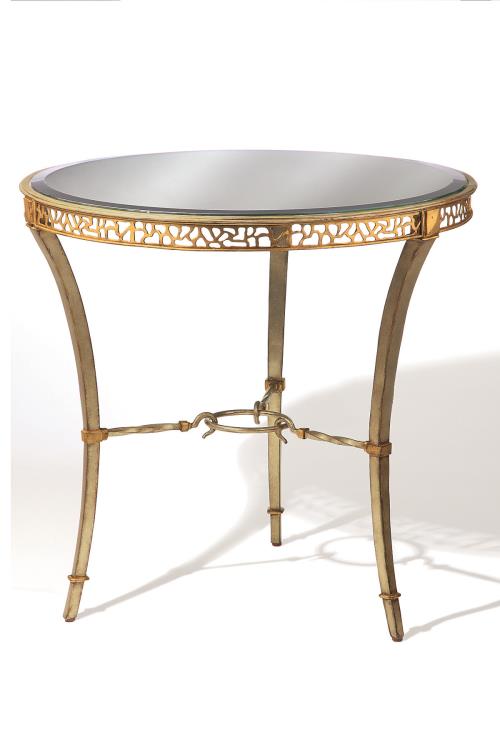 W 30 D 30 H 29 Burnished Silver frame with Venetian Gold Accents. 1/4” Tempered Glass top sits inside a circular shining gold ice sheet cut frame. Legs reinforced and connected with thin twisted hook bar stretchers. In Stock Buy Now