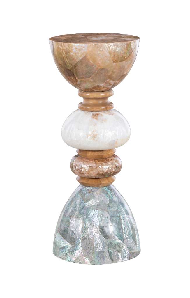 Inspired by the layered elegance of inlaid stacked cuff bracelets, the Bracelet Spot Tables bring a petite yet bold statement to any space. Crafted from a mix of luminous shells — brown lip shell dyed pink, white crackled Kabebe, and green-blue Abalone Crackle — each segment is accented by a turned wood collar in a natural finish. Sophisticated and striking, these tables offer a refined touch of glamor in a compact form.