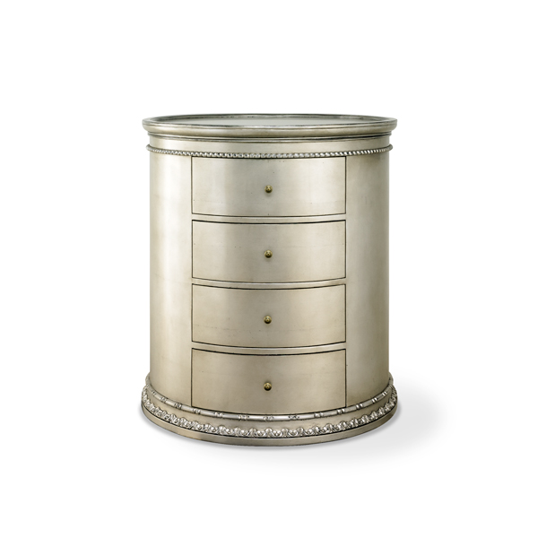 Finish: Warm Silver LeafDouble-Sided with Drawers on Both SidesDiameter: 36” | Height: 40”Available in all OBD finishes.Custom sizes available.