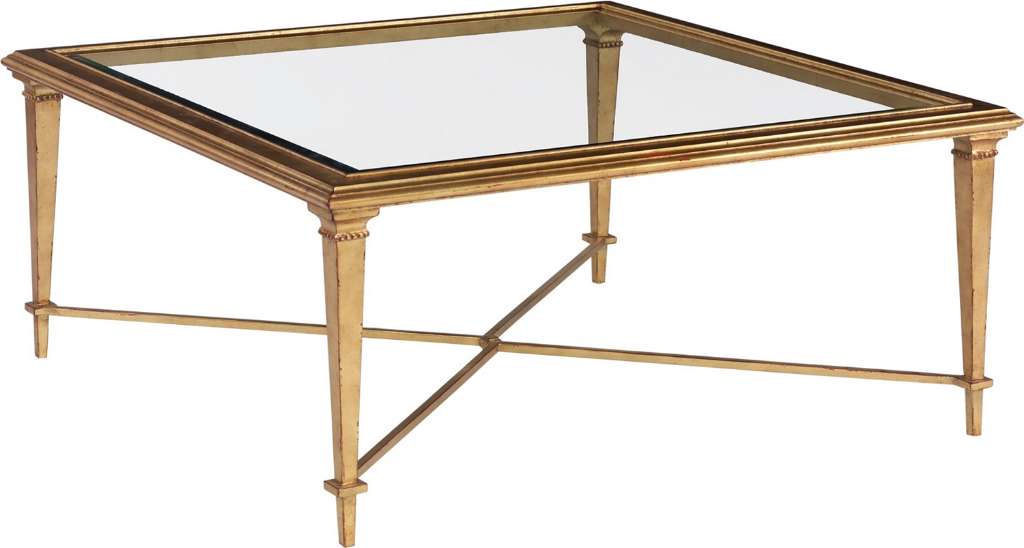 The Square Bristol Cocktail Table features a standard beveled clear glass top. The series is available in Antique Gold Leaf or Antique Silver Leaf. Shown is the HC2581-10 Square Bristol Cocktail Table in Gold Leaf. It is available in Silver Leaf as HC2581-20. Leaf finishes are made with hand applied metal sheets over a base undertone paint. To create an antiqued look, the craftsperson purposely allows the undertone to show through the leafed surface. One will find areas red showing through the gold leaf finish and on the silver leaf finish, areas of a bluish gray. As metal leaf sheets are hand-applied, each table is unique with varying amounts of the undertone showing through the finish. The Bristol Cocktail Table series is also available as a rectangle as HC2580-10 Gold Leaf and HC2580-20 Silver Leaf and as an oval as HC2579-10 and HC2579-20 Silver Leaf.
