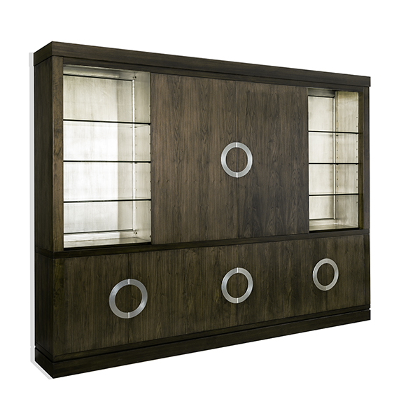 Premium Wood Species: WalnutFinish: Black Walnut W/ Warm Silver Leaf InsetsInterior: Warm Silver LeafTop: Sliding doors, Center Section Mirrored Back, & Lights on Side TowersBotton: Touch Latch DoorsWidth: 120” | Height: 96” | Depth: 19”Available in all OBD FinishesCustom sizes available