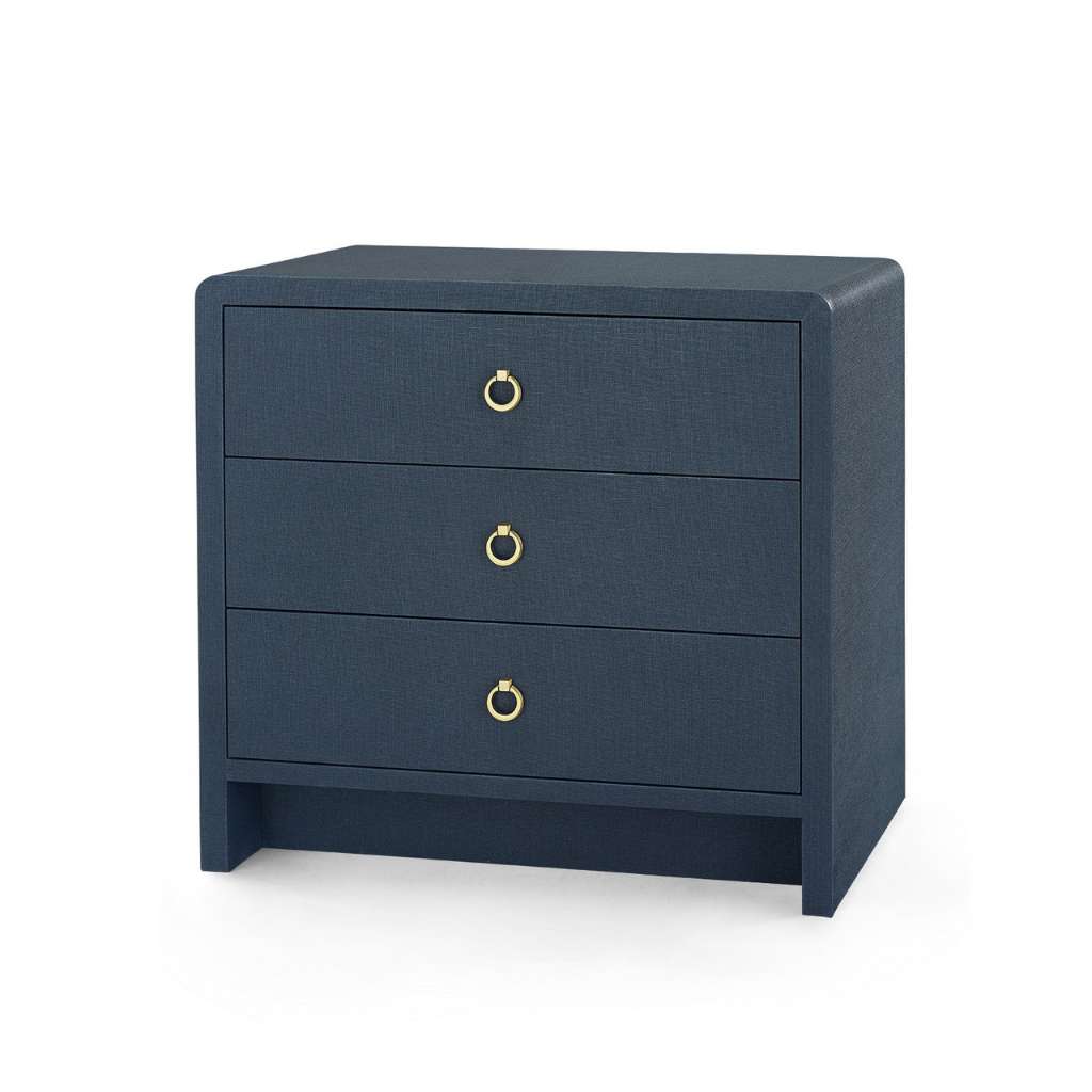 Quiet sophistication is found in the soft curves and classic silhouette of our Bryant Collection. Nevertheless, the Bryant Side Table is full of little details which set it apart. Three drawers seamlessly stack together atop an inset base, producing a subtle play on form, while antique brass accents evoke a tasteful sense of luxury. The piece is executed in lacquered linen with a navy blue, slightly textured finish, making it a rich and uniquely versatile piece fit for almost any decor scheme. Whether standing solo or paired on each side of a bed, the Bryant completes a room with ease.