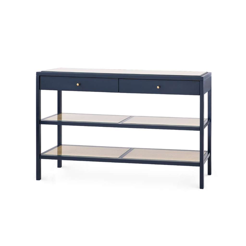 When your space calls for something straightforward and functional, but you don’t want to sacrifice style, look no further than our Caanan Collection. Made by combining lacquered wood with the relaxed touch of cane, the collection is light, airy, and endlessly adaptable. Each of its three shelves is made of woven cane, and is topped with a durable piece of glass. The two top drawers boast polished brass pulls for extra flair. It's perfect for stacking books, storing necessities, or showing off decorative statues.