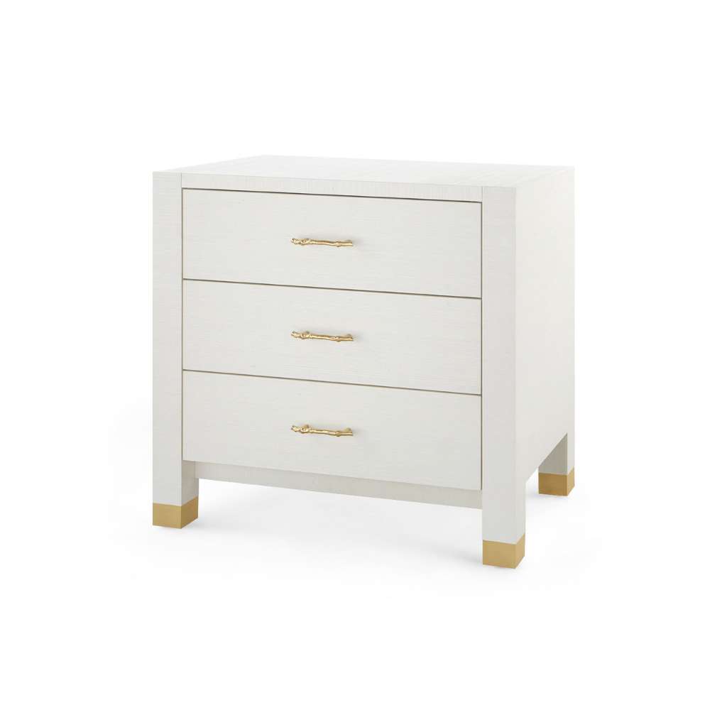 The Camden Collection blends clean-lined sophistication with subtle natural charm. Each piece is carefully wrapped in grasscloth, highlighting its smooth silhouette. Polished brass sabots at the feet add a gleaming, tailored touch, while the top drawer is slightly smaller—perfect for storing petite luxuries. Each drawer is finished with a sculptural pull shaped like a twig, offering an earthy, organic twist to this elegant design. The result is a collection that feels both grounded and gracefully elevated.