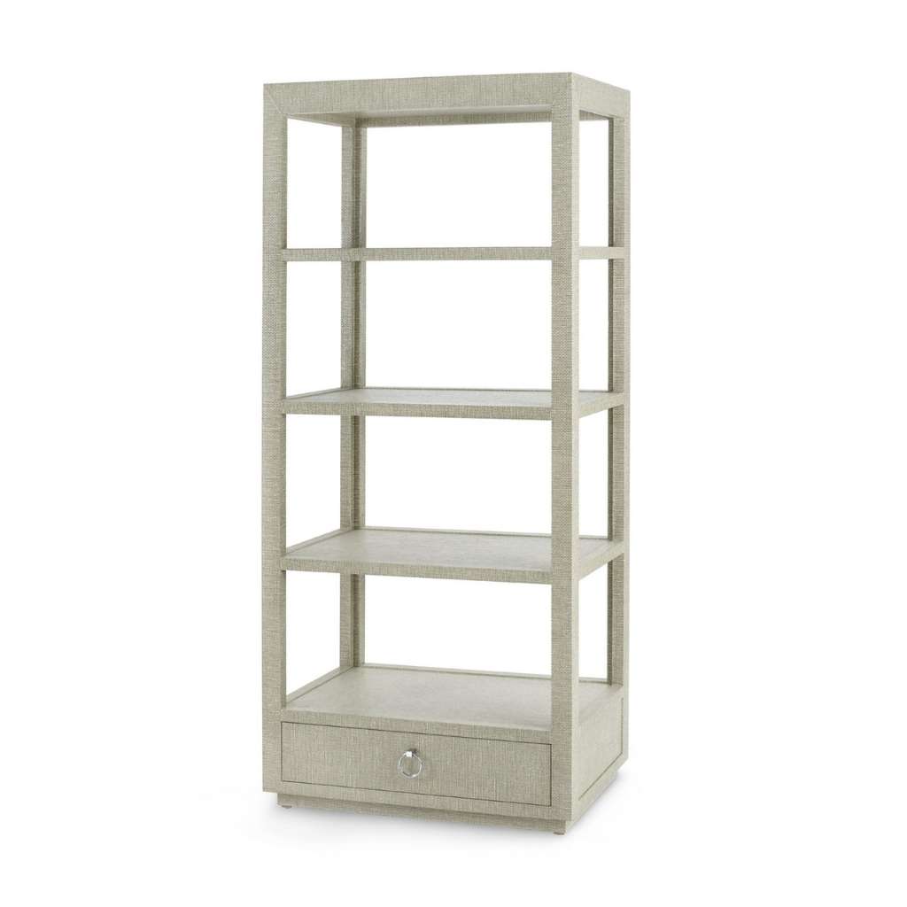 The Camilla’s strikingly modern silhouette plays to contemporary tastes, while its sumptuous materials appeal to those seeking old school luxury. We say it’s the best of both worlds. Structurally, this large-scale étagère stands out with clean lines and sharp angles, which form four open shelves for displaying your collection of art, decorative objects, books, and even plants. Hideaway storage comes in its sleek bottom drawer, anchored above the recessed base, which opens to reveal bold stained wood interiors. A chrome ring pull supplies a glint of glamour, complementing the rich texture and look of the all-over lacquered grasscloth, which comes in a chic white or posh moss gray tweed finish.