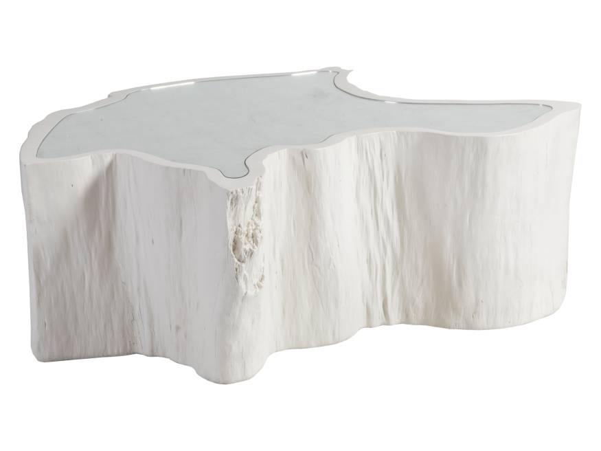 Organic table, nature form casted from true trunk segments and finished in a dry gesso white with inset antique silver leaf backed glass top.