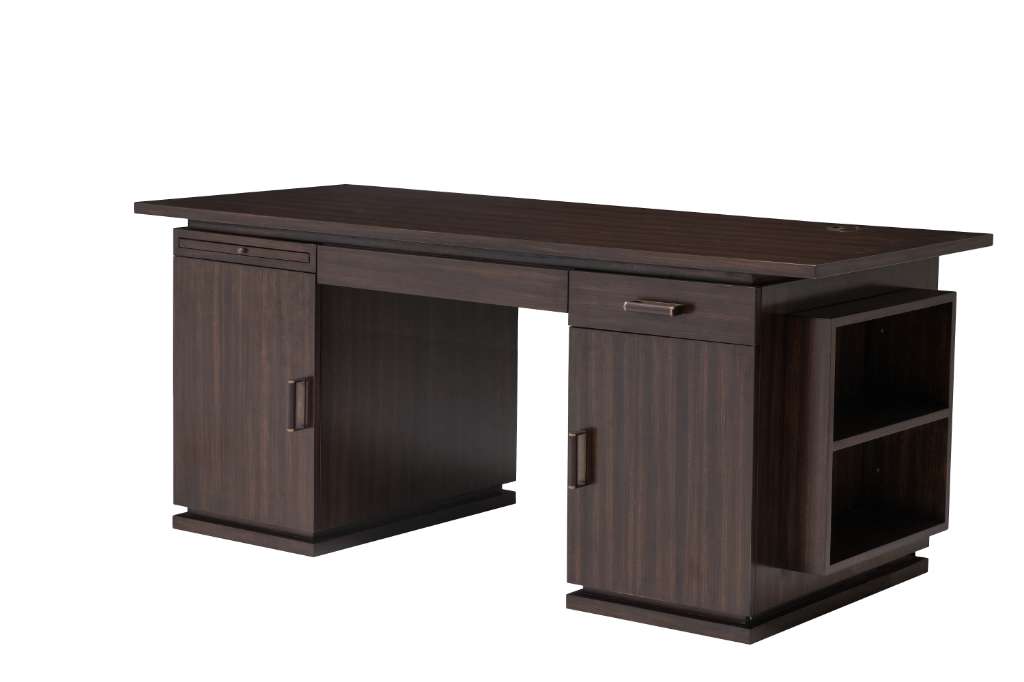 This rare and refined desk is destined to become a family heirloom. Tailored Zebrano veneer adorns the writing surface which tops the interior of this handsome classic - offering two file drawers, adjustable shelving, and a pull-out shelf. For storage and versatility, both sides feature open shelving. Work becomes a pleasure when sitting behind this stately Caravelle Desk. Available in Caravelle finish ONLY.