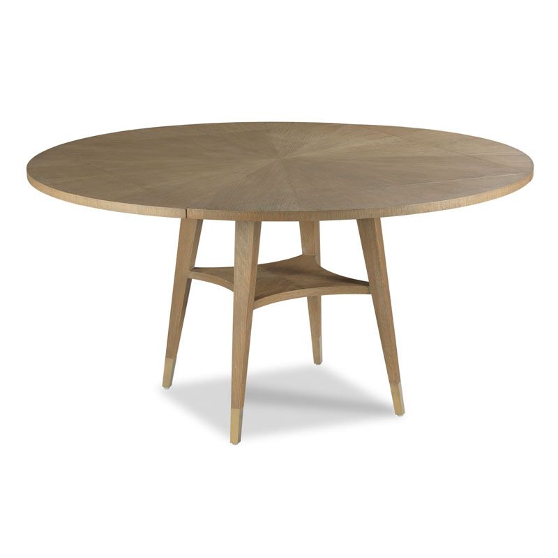 A square top is fitted with hinged leaves that create a round table when the leaves are implemented. The top is elevated on gracefully tapered legs that terminate to satin brass sabots.