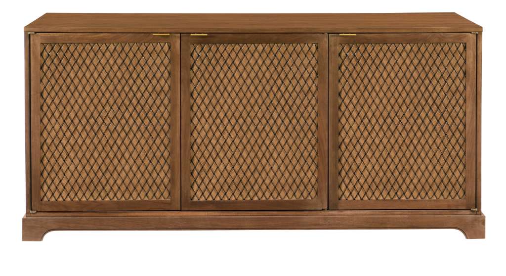 The Carolyn Sideboard was designed with personalization in mind. Available also as a two, three and four door sideboard, the clean architectural lines create the perfect slate ready for personalization. One stack of three drawers and two adjustable shelves behind each door. Standard with lattice door panels. Also available with vertically oriented highly figured American Walnut door panels upon request. Antique Brass pulls standard. Walnut is the primary wood species. River Rock finish shown.