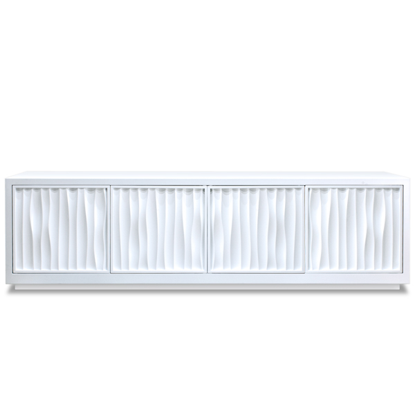 Width: 108” | Height: 30” | Depth: 20”Finish: Stark White with Gloss Top CoatWood Pattern: Large WaveHardware: Touch Latch Doors
