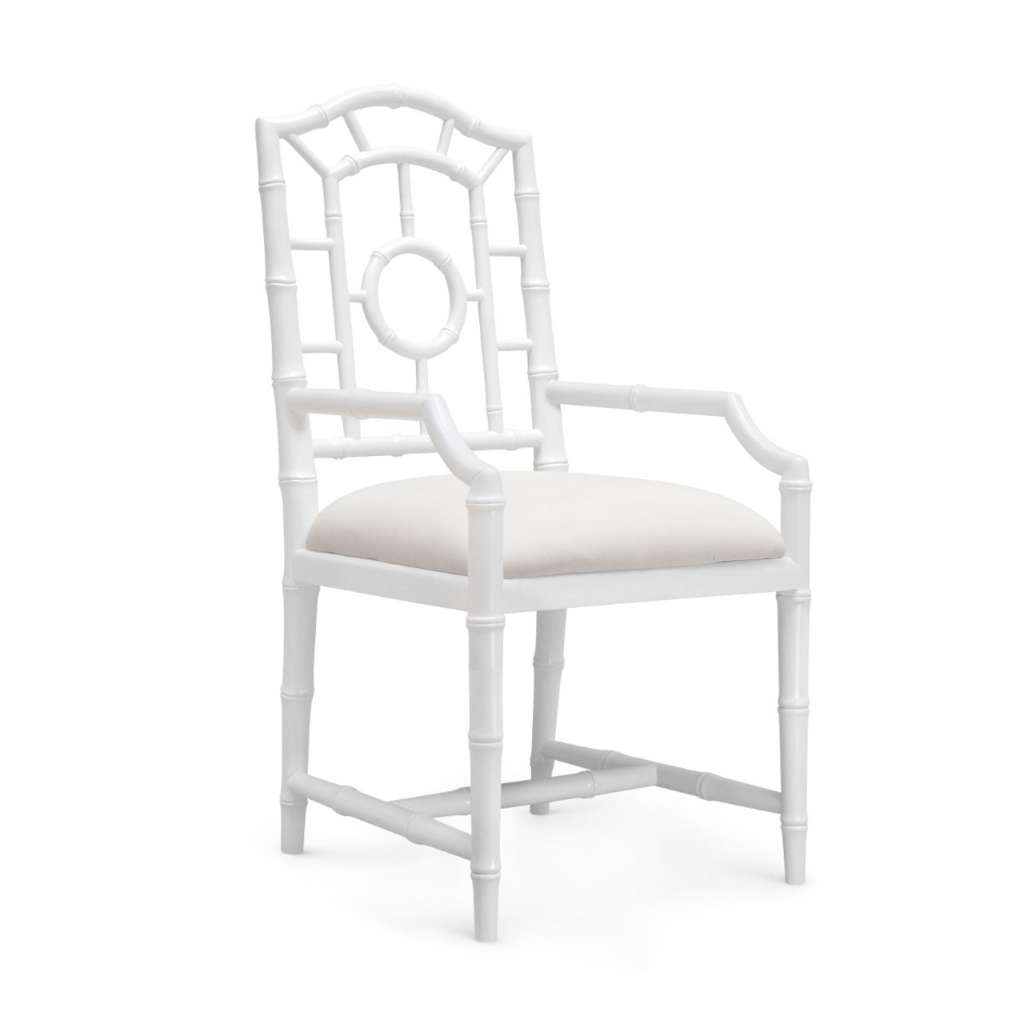 Throughout the Chloe Collection, our craftsmen have taken the ornate elements of Chinoiserie design, made famous by the likes of Thomas Chippendale in the 18th century, and pared them down to showcase their elegant essence through refined simplicity. Solid mahogany has been expertly carved to resemble bamboo, lacquered and finished in clean white, which here makes up the fretwork of the Chloe Armchair, forming an airy, Asian-inspired patterned back. With a lightness fit for a sunny beach home (or a bedroom, living room or study you wish would feel like one), the faux bamboo continues down through the curved arm rests, legs, and decorative stretcher, all pulled together by a comfortable linen drop-in cushion seat. As a set in a kitchen or dining room, these chairs provide upscale luxury with a touch of Pacific paradise.