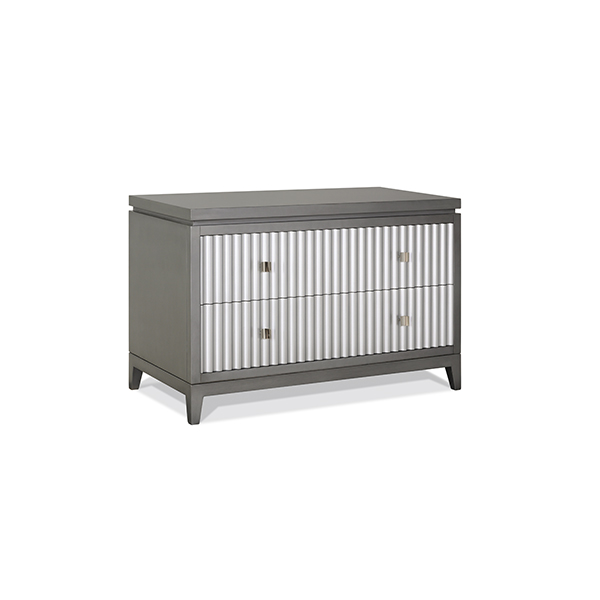 Body Finish: Sterling Drawer Fronts Finish: Bright Silver PearlHardware: Claudette Knobs in Custom Finish (Discontinued) Replacement Hardware: Hex Pull and/or Hex Knob (See Hardware Page 48 & 49)Width: 48” | Height: 32” | Depth: 24”Available in all OBD FinishesCustom sizes available