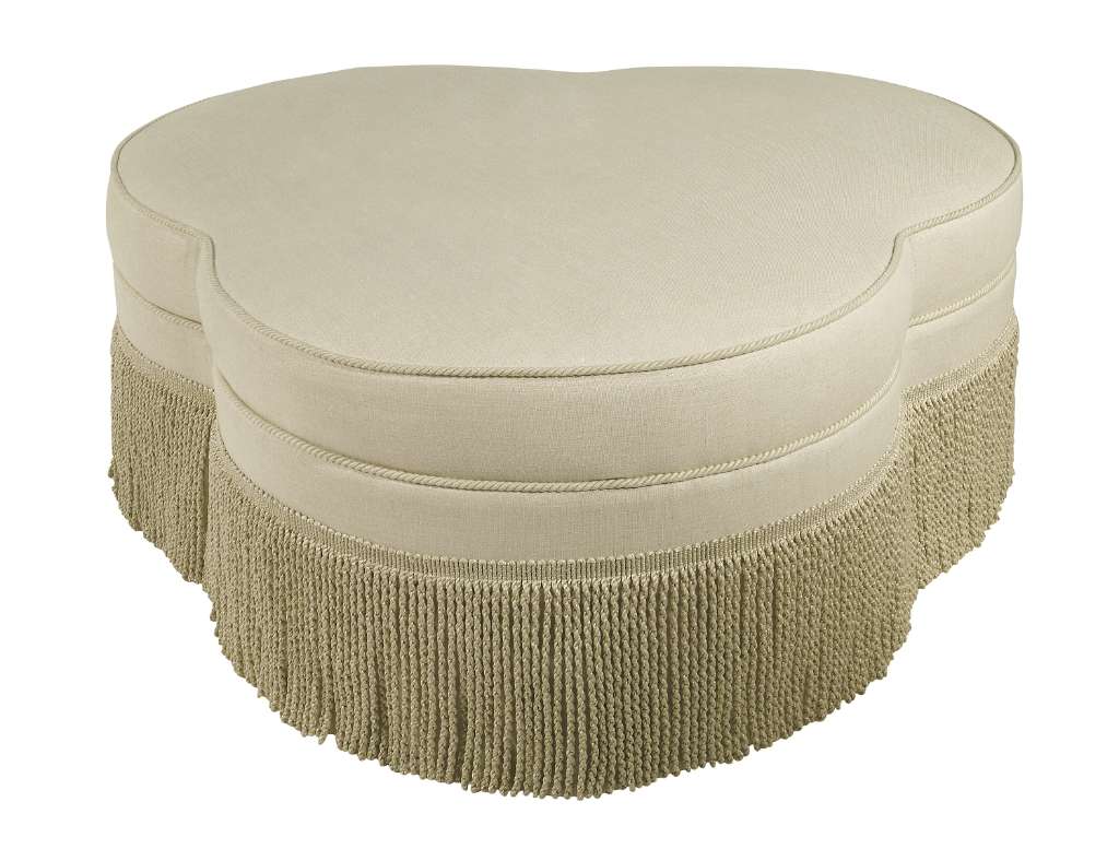 The Cloverleaf Ottoman is a generously scaled cocktail ottoman. It is standard with a kick-pleat skirt or your choice of seven optional skirts. The legs are standard with casters. Shown with optional COM bullion fringe.