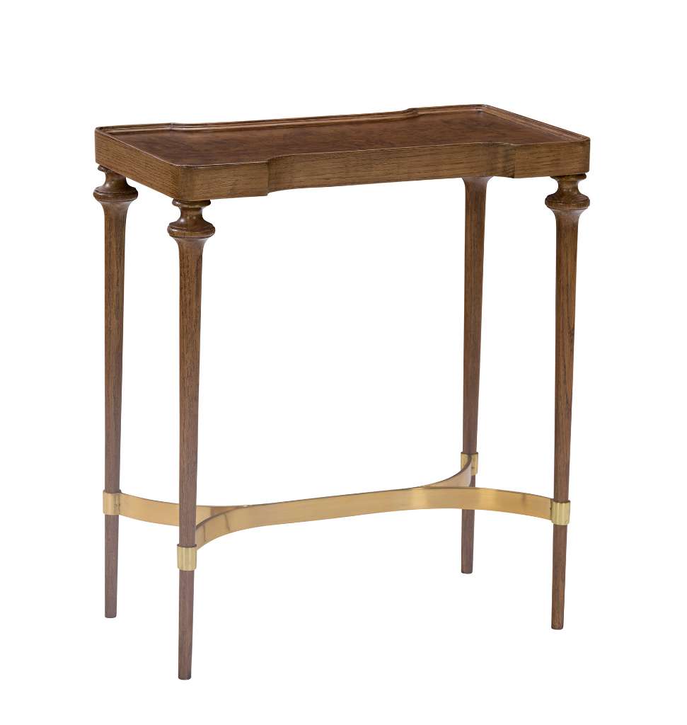 The Cooper Side Table pays homage to Hickory Chair’s traditional roots. It features delicately carved legs that taper to a point, a carved border that encases a beautiful burl top, and is accented with a delicate brass metal stretcher. Only available as shown, this finish is a cousin to Hickory Chair's Chestnut finish.
