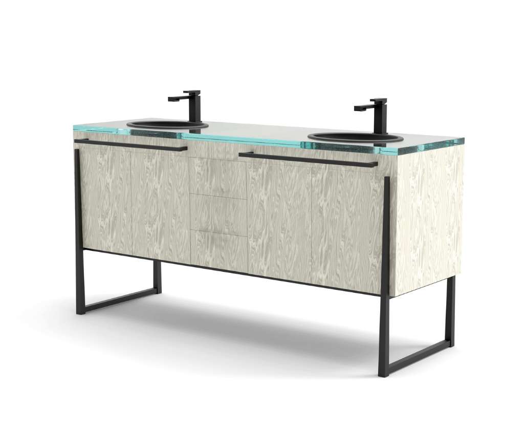 Our vanity line brings together everything that Charleston Forge is known for. Beautiful design that incorporates bespoke materials and meticulous construction. Form and function, all made by hand. The base is made of solid steel and is available in any of our metal finishes. The cabinetry is available in Ash, Maple, and Walnut veneers with all our wood finishes available. We chose to use a wood veneer as veneers handle moist environments, such as bathrooms, better than solid wood. The cabinets are finished with a durable urethane top coat to further ensure this. All top surfaces are our 3/4-inch backpainted Ultraclear Fuzion Glass with Minimal texture. The texture faces up and the backpaint comes in a variety of options, including our ability to customize to whatever color you wish. The inset sinks are made of hammered aluminum and available in two different finishes — white and black. The glass tops are also pre-drilled for faucets. Vanities are currently offered as part of our Camden, Cooper, Jasper, and Watson collections.