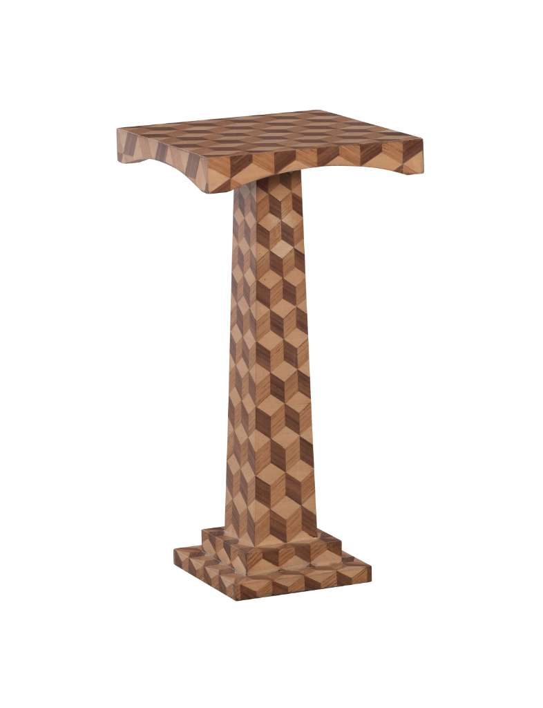 The Cora parquetry spot table is truly one of a kind. Meticulously hand-cut and inlaid, three distinct wood veneers come together in a striking composition atop a sculptural tiered base. A subtle arc detail traces the perimeter of the top, enhancing its graceful profile. The parquetry creates a three-dimensional effect where planes converge, showcasing the artistry of craftsmanship. Finished with a clear coat, the veneers are allowed to shine, highlighting the natural beauty and contrast of the wood. Available only as shown.