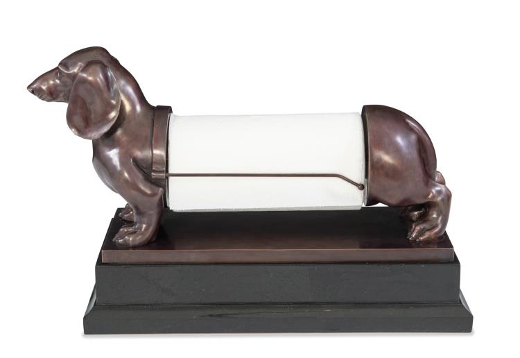 W 25.9 D 9 H 15.1 Cast brass dachshund paper towel holder, finished in hand rubbed dark bronze on a green waxstone base. In Stock
