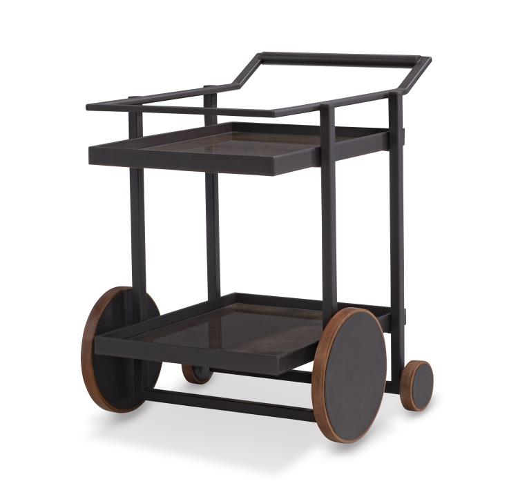 W 20.75 D 24 H 28 Black Leather and English Walnut bar cart. Brown felt lined shelves with a protective glass insert. In Stock