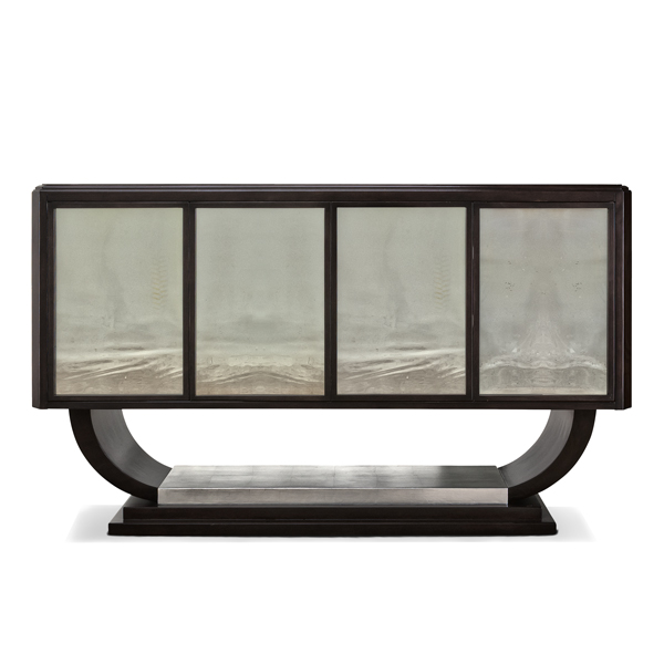 Finish: Antique WalnutBase Accent: Silver LeafFour (4) Touch Latch Doors With Hand-Blown MirrorInterior: Two (2) Adjustable ShelvesWidth: 72" | Height: 42" | Depth: 20"
