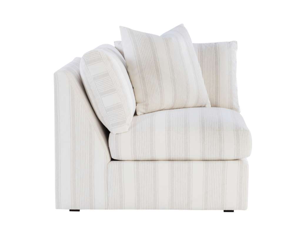This geometric sofa and sectional series were inspired by European luxury fashion. Susan designed the Denby to be low and deep making the series inviting and comfortable. Signature arms wrap over the seat cushion creating not only a modern attitude, but also an efficient solution for keeping the seat cushion in place. One 20-inch goose feather throw pillow, weltless with hidden zipper standard in fabric. When ordering this item in leather, please note that pillows are not included and must be purchased separately. To match the standard pillows included with the fabric version, order an additional quantity of pillow SKU HC920-96. Spring-Down seat cushion and Blend-Down back cushions standard.